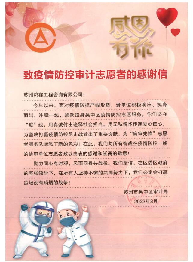 志愿者支援活动结束后,我公司获得了相城区元和街道莫阳社区赠与的锦旗,以示感谢,还收到了苏州市吴中区审计局的感谢信,这都是主管单位对我们志愿者服务的认可。